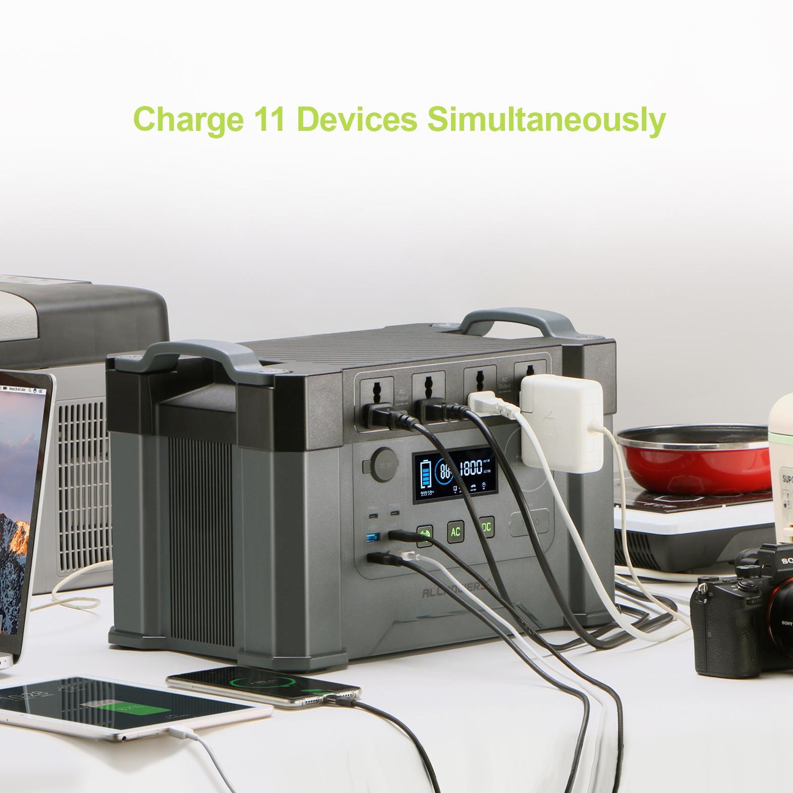 Portable battery to charge up to 11 electrical devices at the same time, ALLPOWERS 2000W portable power bank with 4 AC outputs (rated 2000W surge 4000W, sine wave), 4 USB ports (5V3.5A/9V2.5A/12V2A) and USB port (100W fast charging) and a car port (13V10 load capacity A: The maximum load capacity 1 can charge 1 device at the same time. It can be used not only for outdoor activities such as overnight car camping, but also as a power source for disaster relief during earthquakes, etc. Very useful.