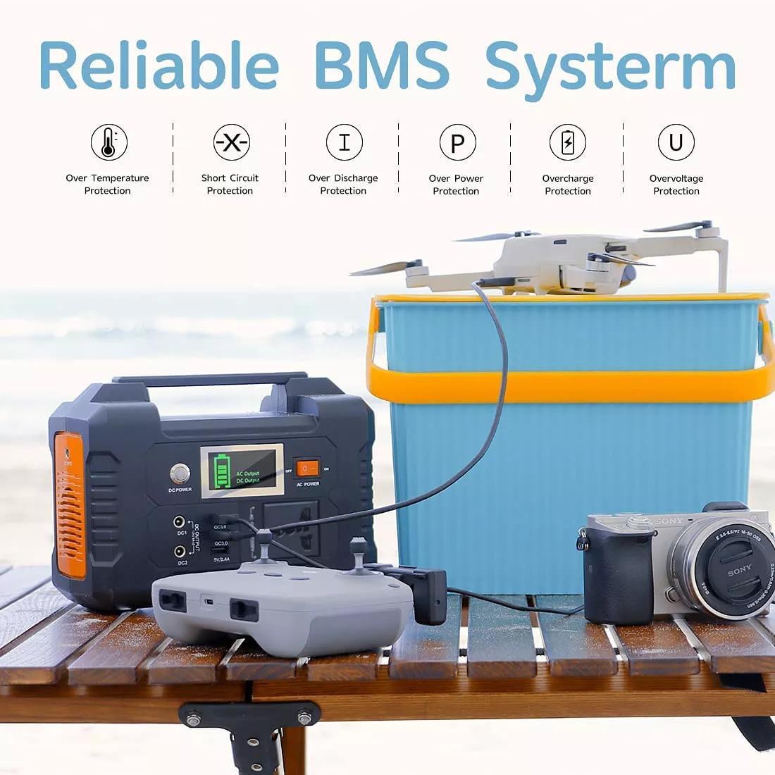 FlashFish power station is equipped with a lithium battery pack, it can be charged by the 15-24 volt solar panel (not included), AC wall adapter and car charger efficiently. No memory effect, no worry about battery capacity reduction.