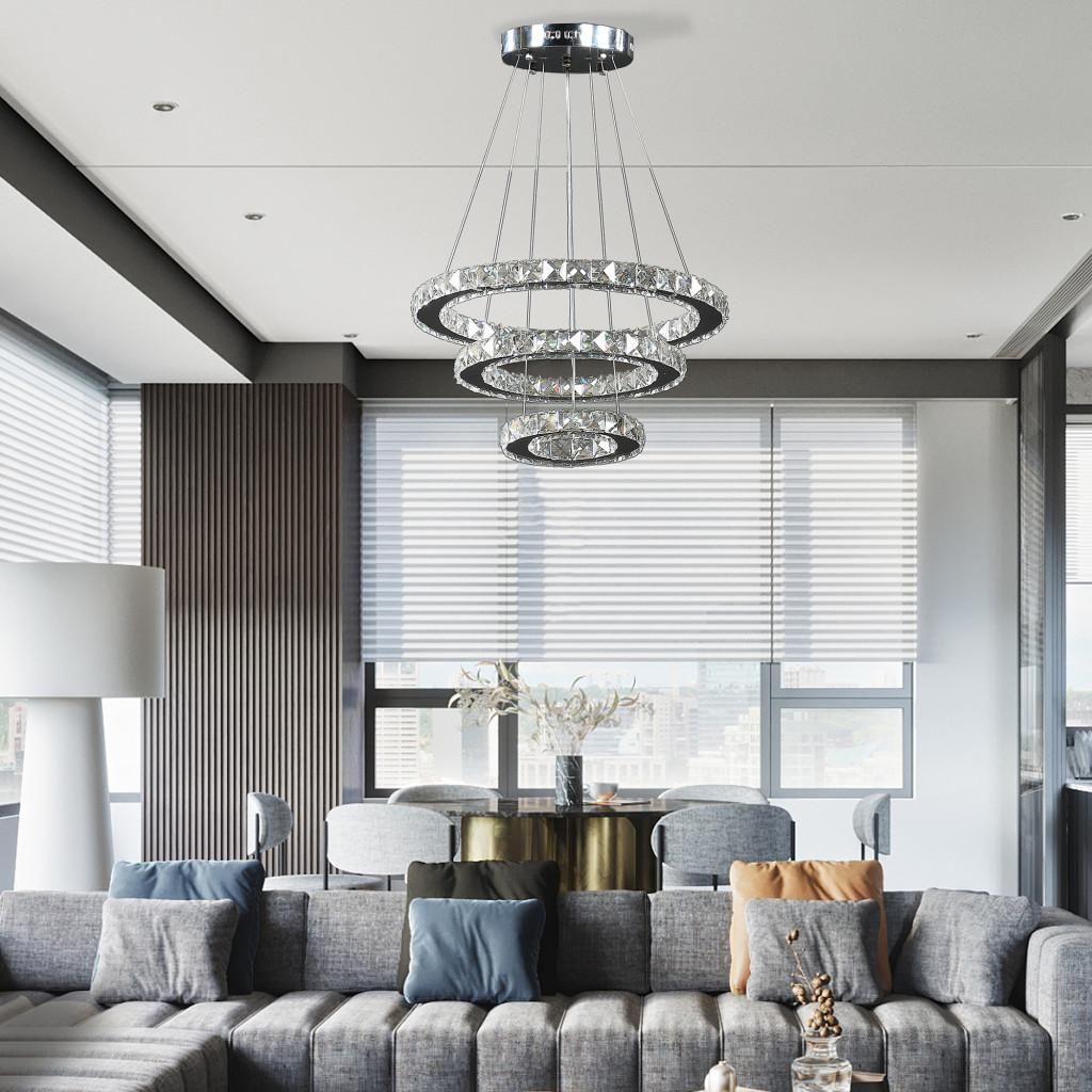 Brighten up your space with this gorgeous silver chrome geometric asymmetrical stacking rings LED chandelier. Contemporary and with a touch of glam, this unique fixture suspends from the ceiling with clear wire cables and features rings full of faux crystal pieces to light up your space. Use this lighting fixture as the focal point of your hallway, dining room, living room, bedroom. 47.2″ H x 27.5″ W x 27.5″ D