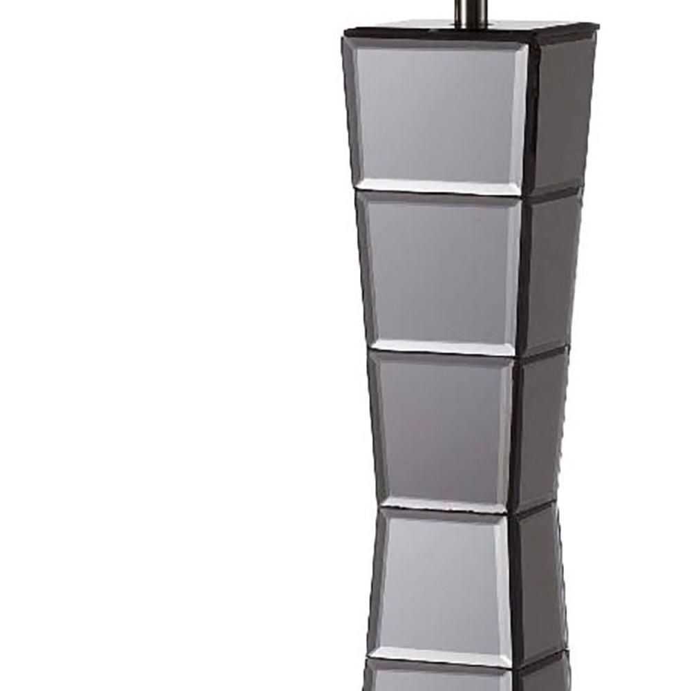 The base of this lamp features a sleek and modern black glass panel tower, adding a touch of sophistication to its simple square shape. The tower itself is uniquely designed, with a wider shape at both the top and bottom, while the middle is cinched, creating a visually appealing silhouette.