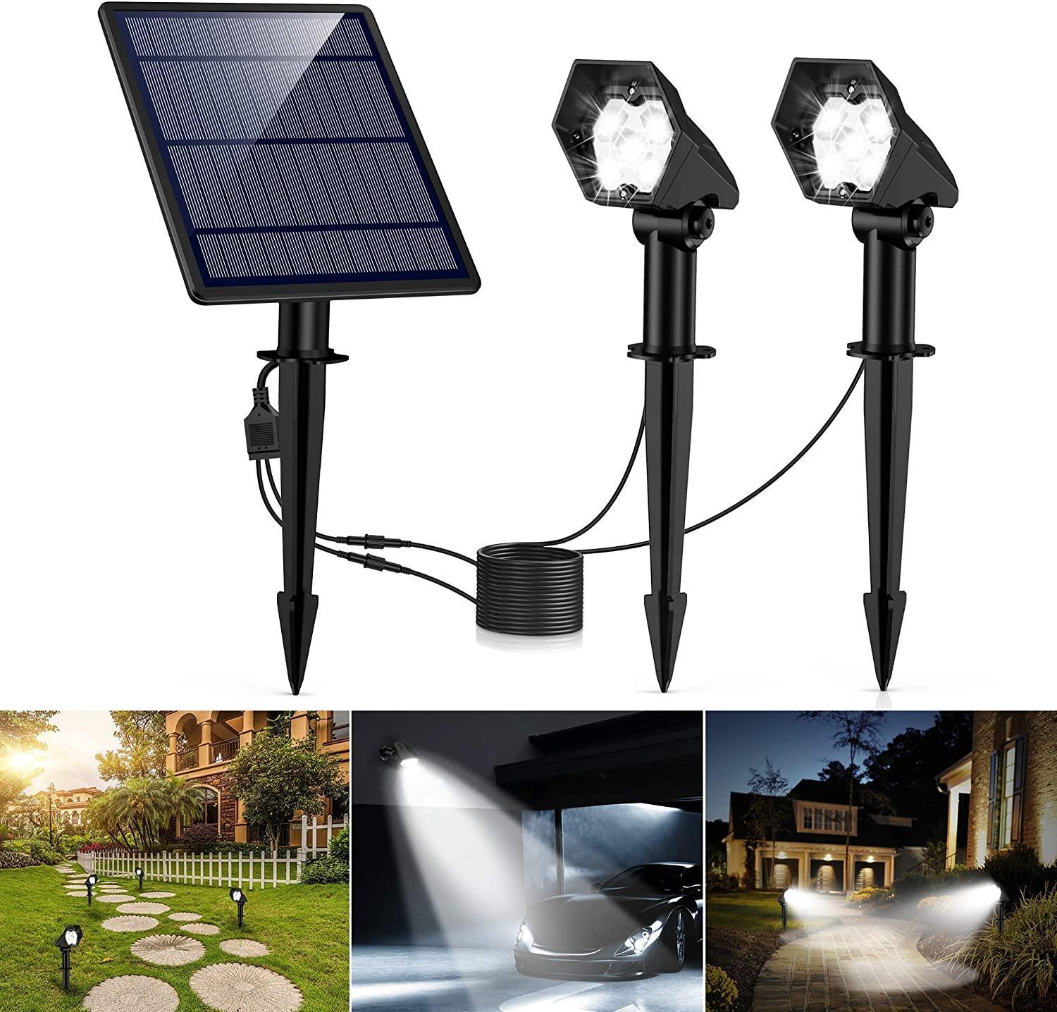 Long waterproof cable with connectors, waterproof IP65, two lamps with spike, adjustable projection angle. Wall mounted and ground inserted both are very easy.