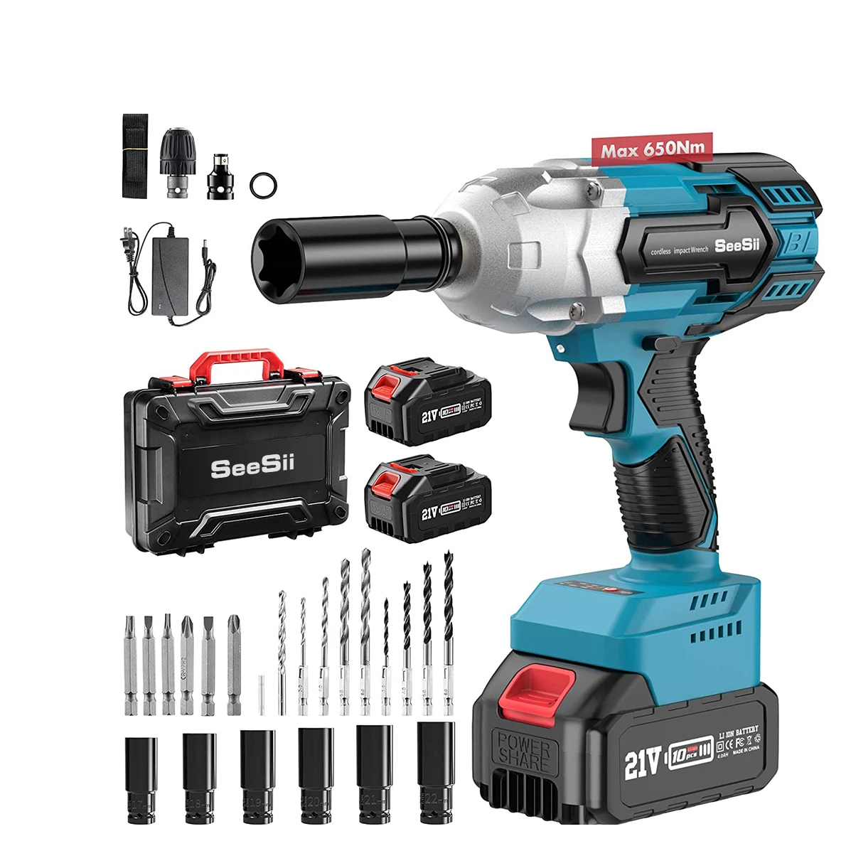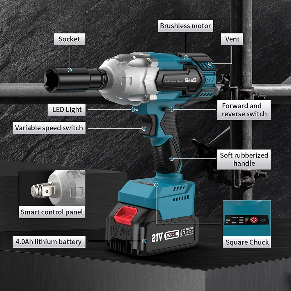 SEESII 21V MAX Cordless Brushless Wrench 650N.m High Torque Electric Impact Wrench with 2 pcs 4.0AH Battery Pack