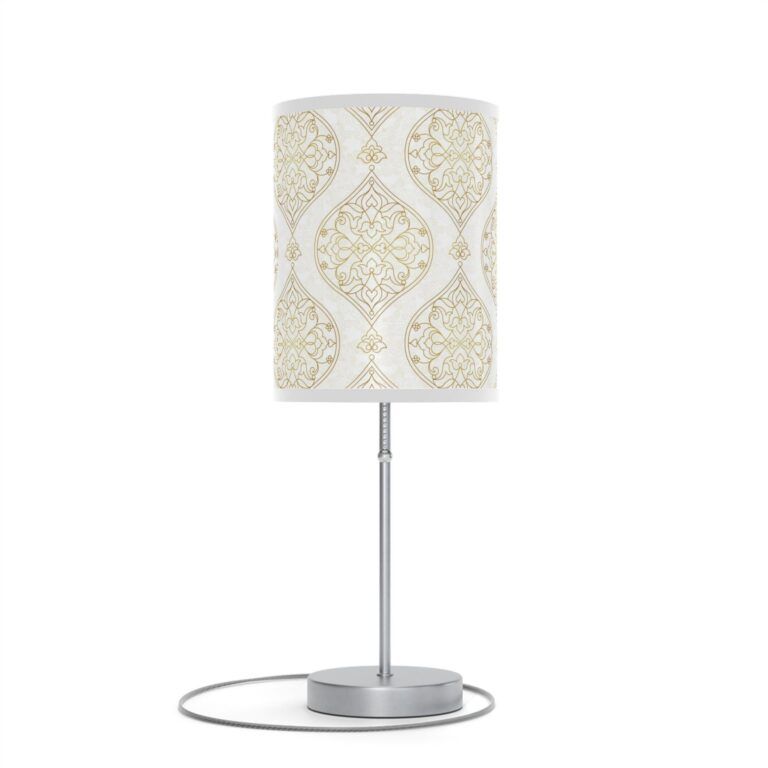 20″ Silver Table Lamp With Gold And White Filigree Scroll Cylinder Shade